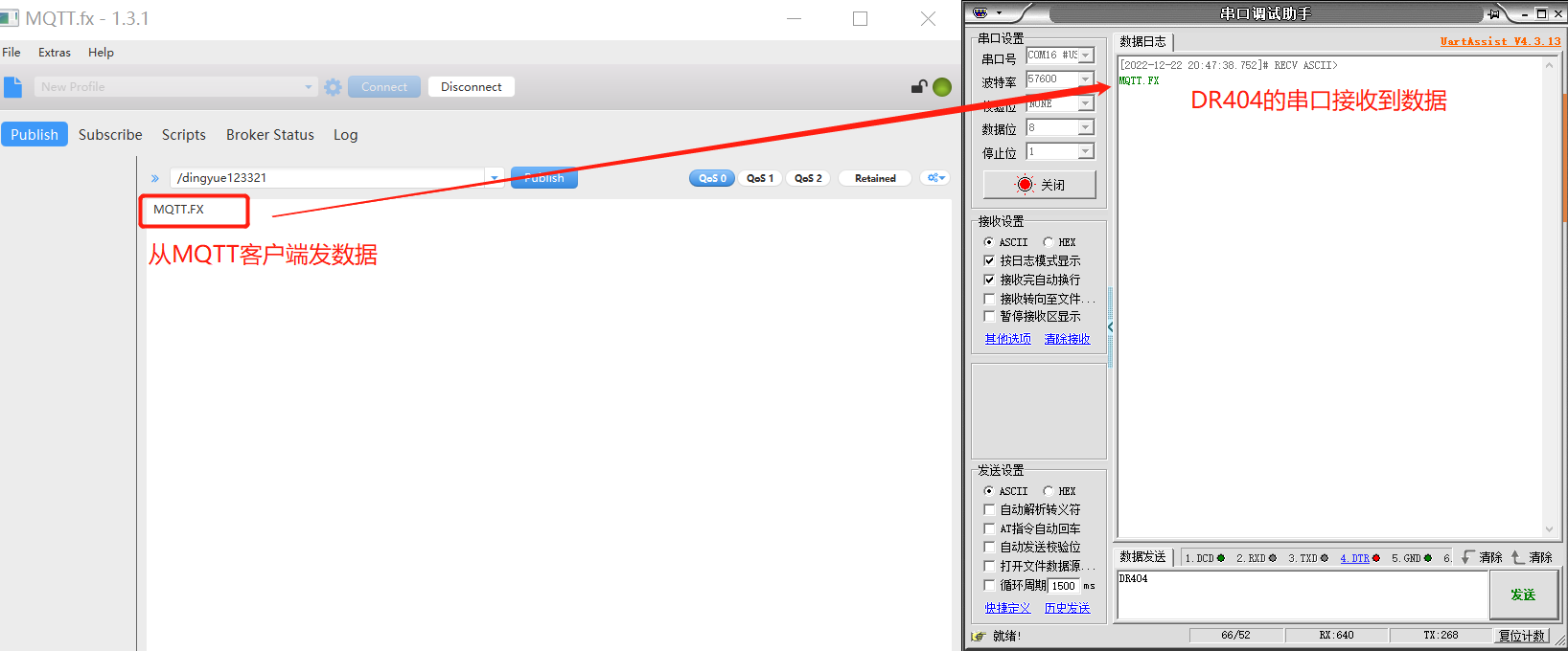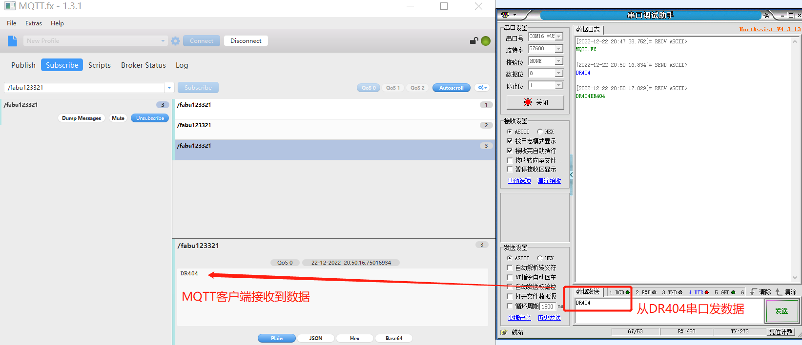 選擇好對(duì)應(yīng)的串口參數(shù)后,點(diǎn)擊打開串口,進(jìn)行數(shù)據(jù)測試??梢钥吹綇?/span>MQTT客戶端發(fā)數(shù)據(jù),DR404串口端收到數(shù)據(jù);從DR404串口端發(fā)送數(shù)據(jù),MQTT客戶端也可以收到數(shù)據(jù),數(shù)據(jù)通信成功。