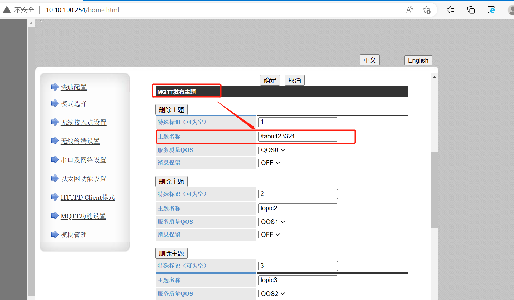6. MQTT客戶端軟件的“發(fā)布主題”,填寫DR404的訂閱主題;MQTT客戶端軟件的“訂閱主題”,填寫DR404的發(fā)布主題。