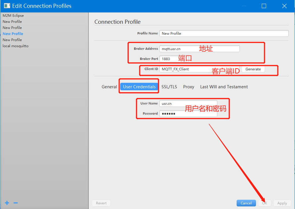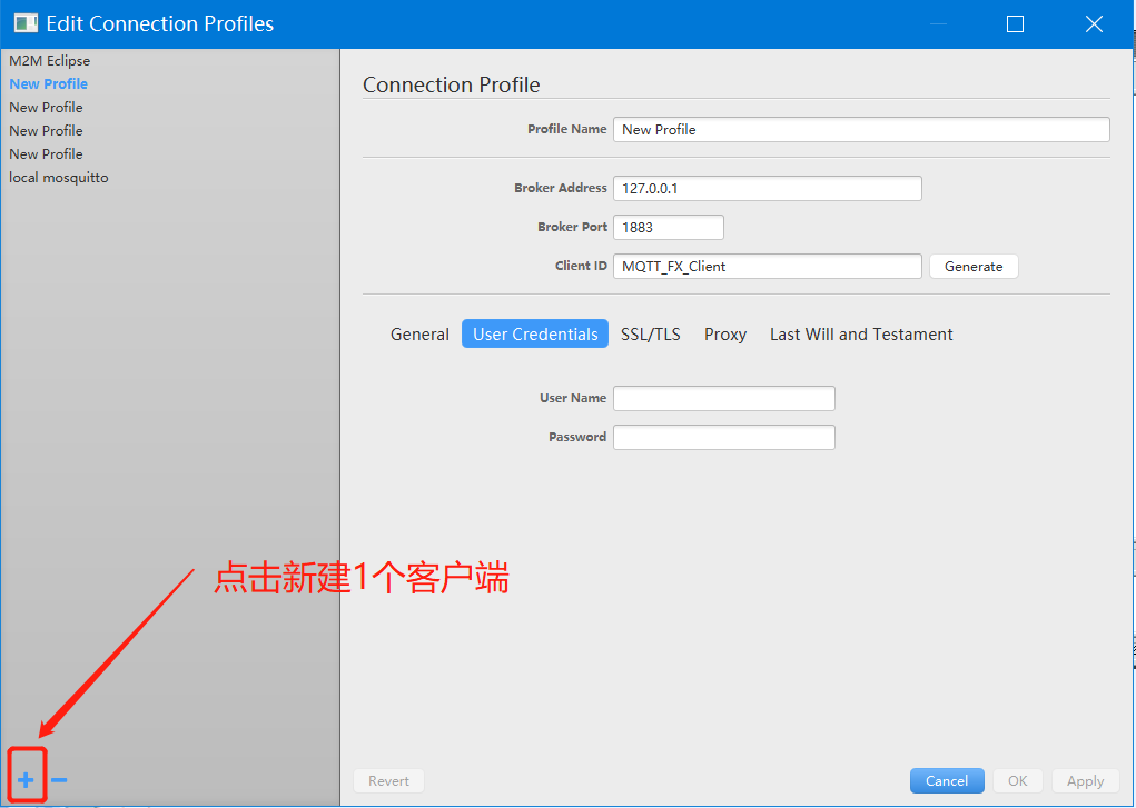 5.打開MQTT Client 軟件:MQTT.FX,點(diǎn)擊左下角新建1個(gè)客戶端,填寫好MQTT服務(wù)器的參數(shù)后,點(diǎn)擊“Connect”,右側(cè)出現(xiàn)綠點(diǎn)表示連接成功。