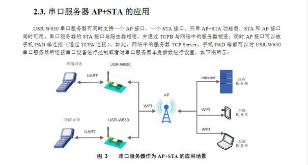 如此,網(wǎng)絡(luò)中的服務(wù)器TCPServer、手機(jī)/PAD等都可以對USR-W630串口服務(wù)器所連接串口設(shè)備進(jìn)行控制或者對串口服務(wù)器本身參數(shù)進(jìn)行設(shè)置。