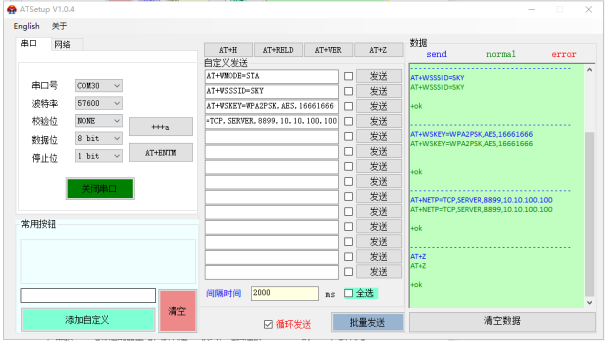 電腦打開USR-W630的設(shè)置軟件,點(diǎn)擊串口,選擇對應(yīng)的串口線COM口號。右側(cè)可以輸入以下AT指令,逐條發(fā)送,串口AT指令設(shè)置AP+STA。