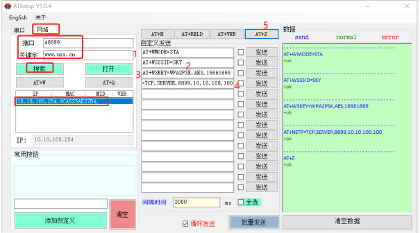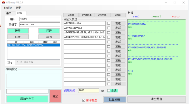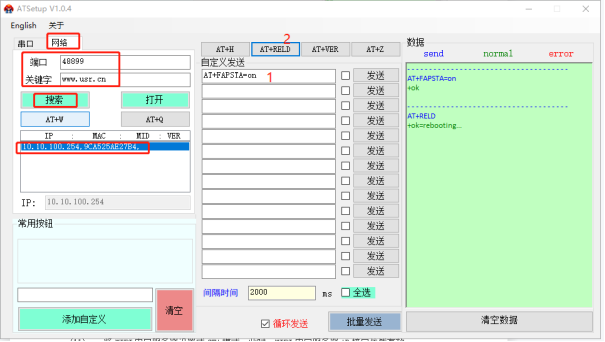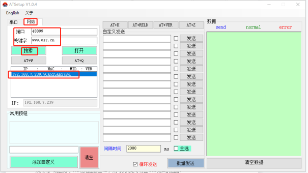 (4)再次點(diǎn)擊網(wǎng)絡(luò)搜索,用搜索端口48899,搜索關(guān)鍵字www.xyglz.cn 去搜索USR-W630的IP,點(diǎn)擊IP,右側(cè)可以輸入以下AT指令,逐條發(fā)送。