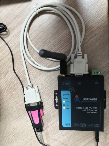 USR-W630的232串口接USB-RS232串口線到電腦USB口,然后產(chǎn)品接12V電源適配器上電。