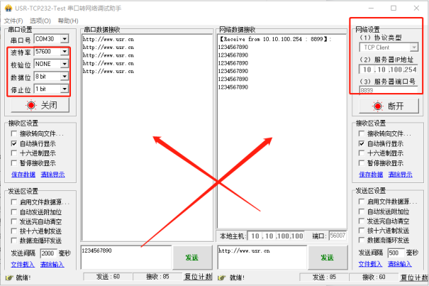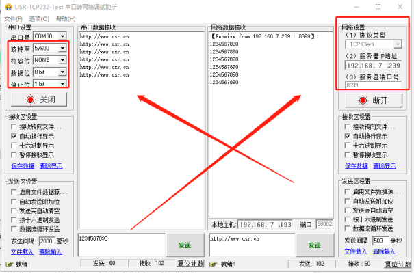 打開串口網(wǎng)絡(luò)助手,打開USB-RS232串口線COM口,波特率57600,網(wǎng)絡(luò)端用TCP client,服務(wù)器地址填路由器給USR-W630分配的IP 192.168.7.239,服務(wù)器端口填8899,點(diǎn)擊建立TCP連接,測試串口和網(wǎng)絡(luò)之間數(shù)據(jù)傳輸。