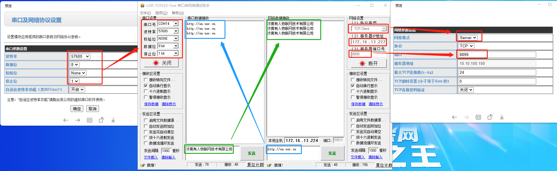 實(shí)際測試中調(diào)試助手的網(wǎng)絡(luò)端和串口端互發(fā)數(shù)據(jù)不通可參考五章節(jié)附件4排查