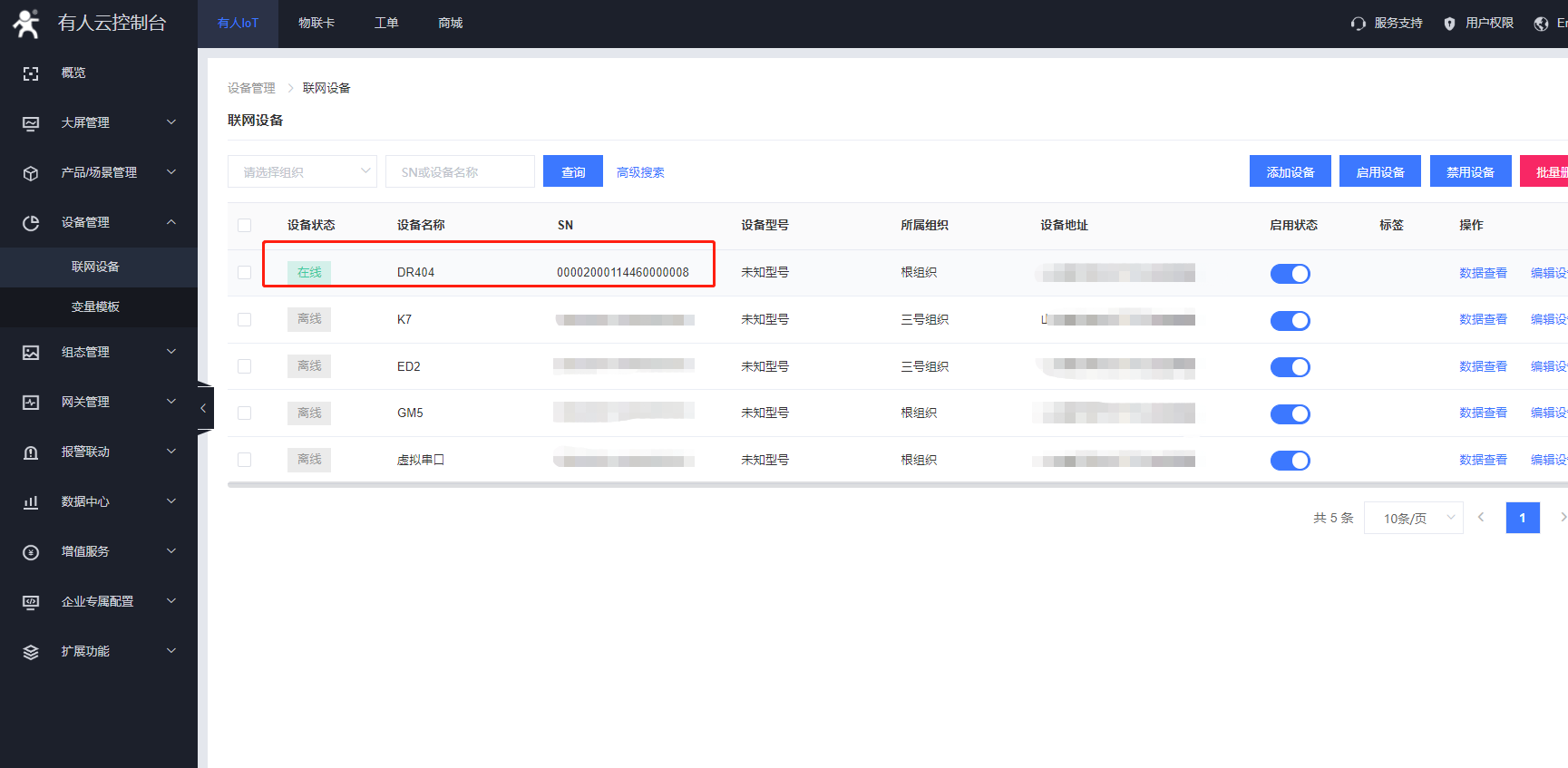 保存參數(shù)之后可以看到有人云DR404設備上線。