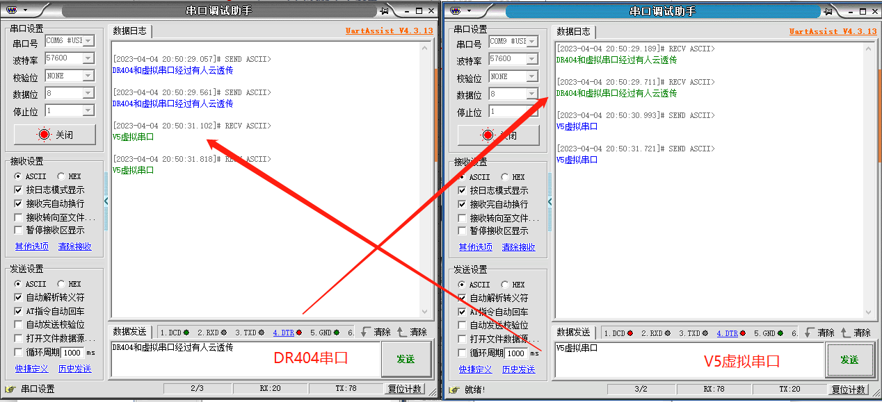 打開兩個串口調(diào)試助手,一個是虛擬串口,一個是DR404的串口,可以實現(xiàn)數(shù)據(jù)互傳。