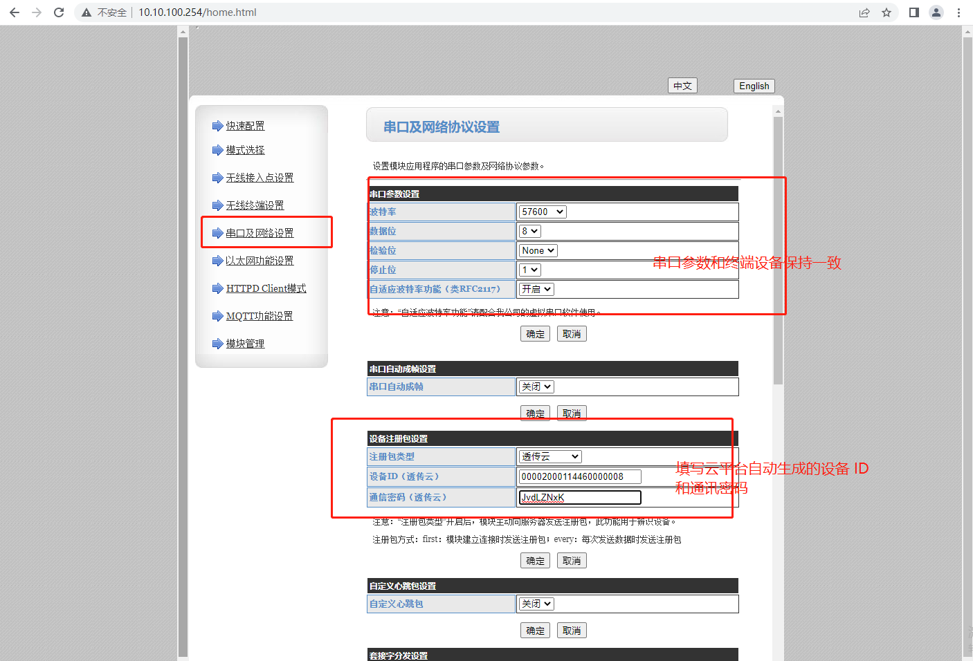 開啟注冊包,選擇透傳云模式,填寫云平臺生成的設備ID和通訊密碼。