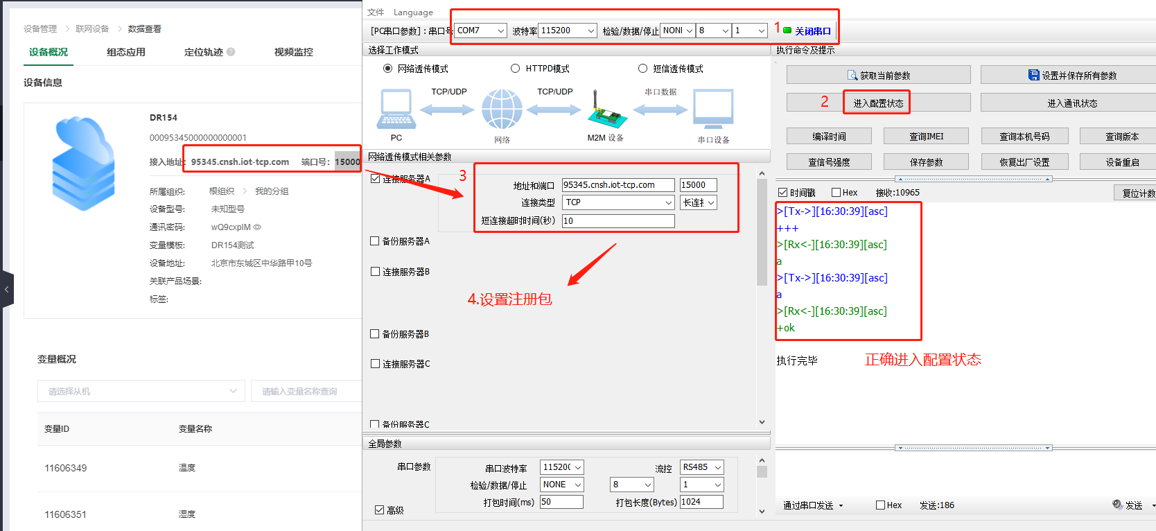 2、確認是打開串口--進入配置狀態(tài)下設置的參數,不在配置狀態(tài)下填寫的參數不生效,如無法進入配置狀態(tài)個根據附件二排查