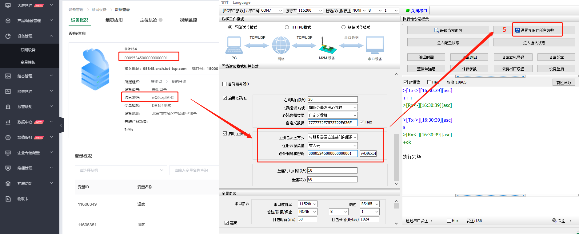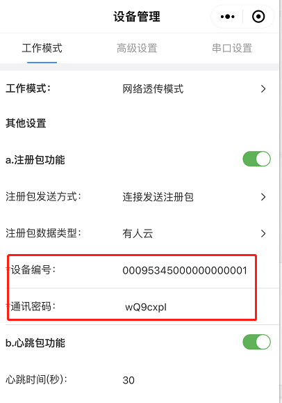 打開設置軟件--選擇串口參數(115200,N,8,1)--進入配置狀態(tài)--地址和端口--啟用注冊包(有人云)--設置編號和密碼--設置并保存參數--等待設備重啟--有人云平臺在線