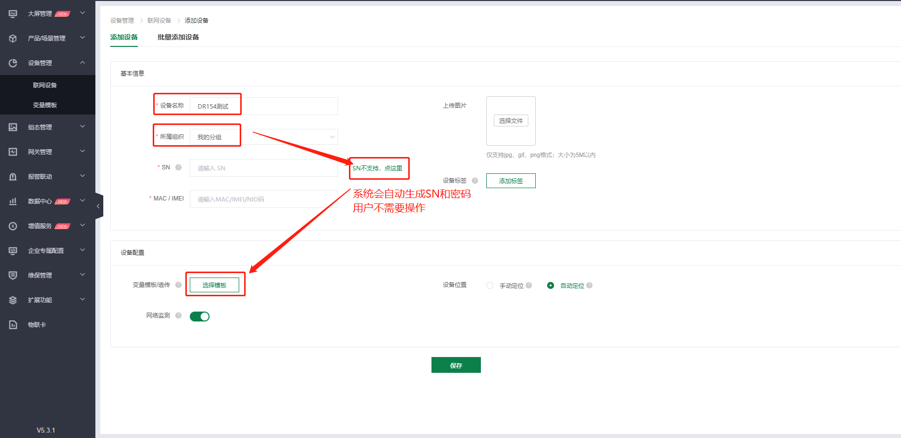 云平臺添加設備,在設備管理---聯(lián)網設備--添加設備,SN和MAC/IMEI可以點擊SN不支持,系統(tǒng)自動生成,不需要客戶自己設置,通訊密碼可以自定義8位密碼