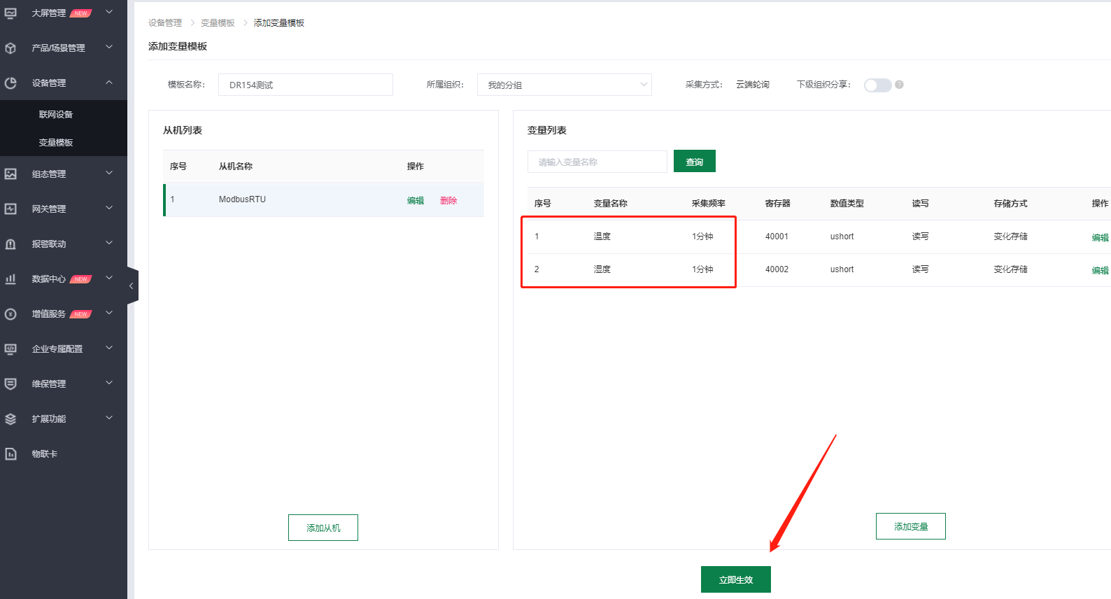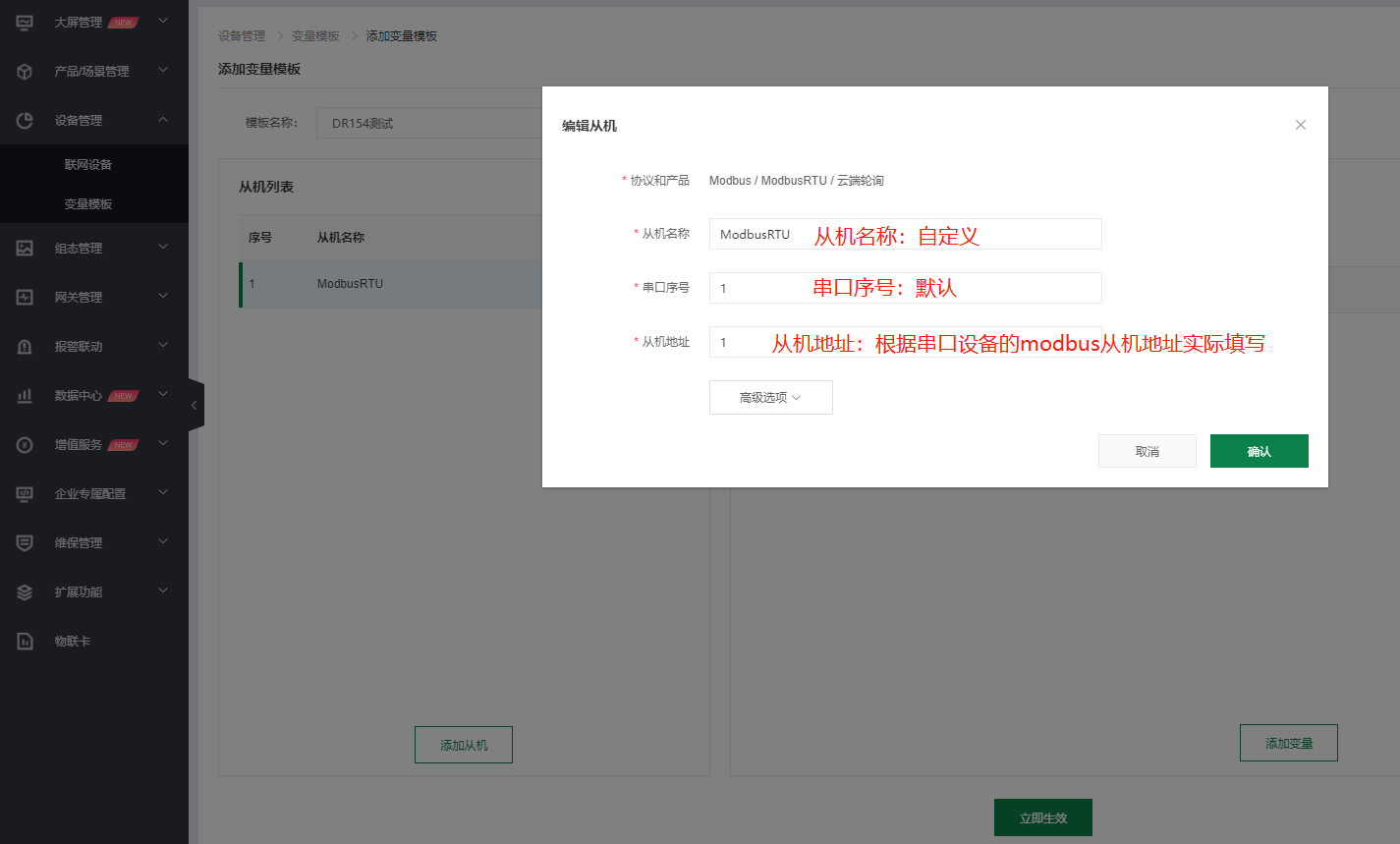 3、有人云平臺選擇云端采集MOBUS RTU,填寫正確的從機地址(設備號)、功能碼與設備真實寄存器起始地址對應