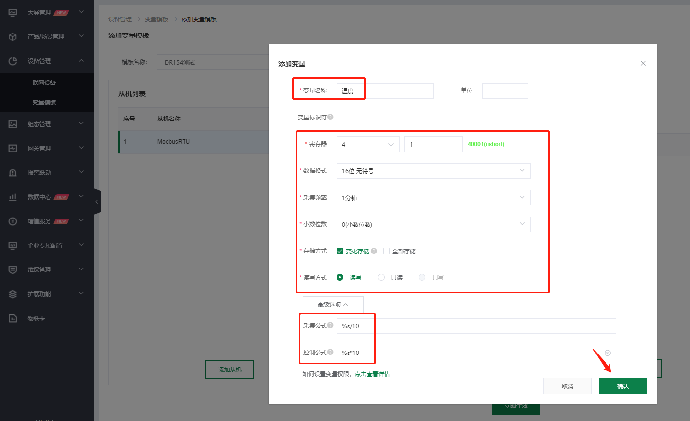 在添加變量的時候,添加了除以10的公式,所以云平臺的實際顯示值是modbus slave中的1/10;