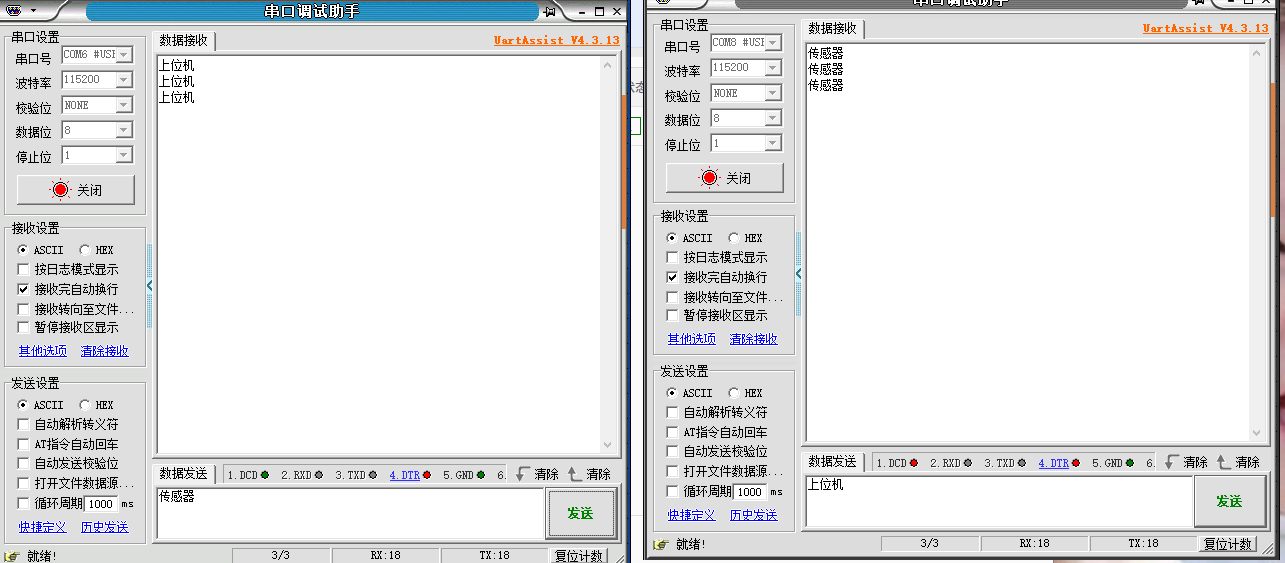 在電腦上打開兩個(gè)串口助手的測(cè)試軟件,分別去調(diào)用設(shè)備管理器中生成的端口。此案例中使用com6的串口助手模擬的傳感器。虛擬串口com8、串口助手模擬上位機(jī)調(diào)用com8讀取傳感器的數(shù)據(jù)??梢钥吹缴衔粰C(jī)與傳感器的數(shù)據(jù)交互。