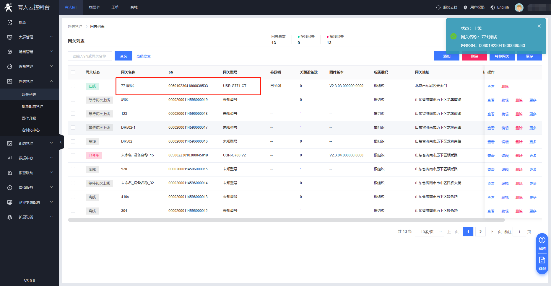 在網(wǎng)關(guān)管理---網(wǎng)關(guān)列表可以看到我們掃碼添加的G771設(shè)備,如果設(shè)備目前處于離線狀態(tài),可以檢查一下設(shè)備自身是否可以正常聯(lián)網(wǎng)。在設(shè)備正常聯(lián)網(wǎng)狀態(tài)下可以重啟下設(shè)備,可以看到設(shè)備的在線信息。