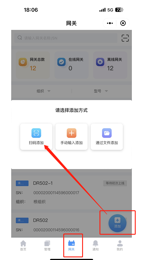 4、若批量購(gòu)買網(wǎng)關(guān)設(shè)備,可以掃描紙質(zhì)出貨單上方的“掃碼即可上云”二維碼批量添加網(wǎng)關(guān)設(shè)備