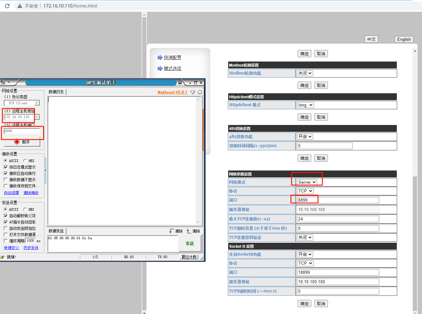 2、電腦上打開一個網(wǎng)絡(luò)調(diào)試助手和W630建立TCP連接。