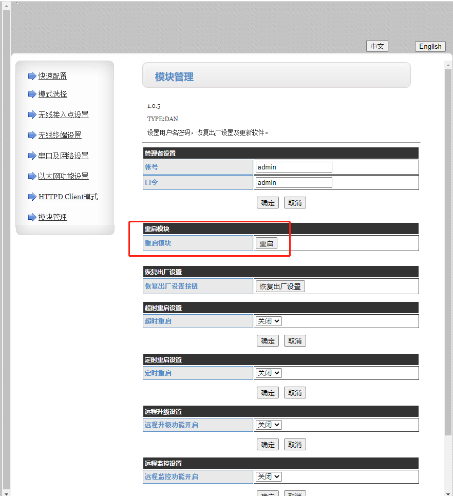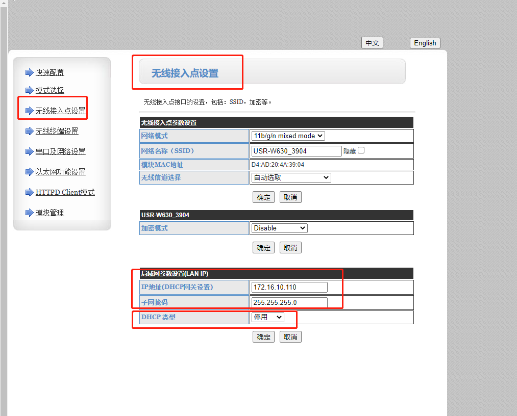 3、配置【無線接入點設(shè)置】 將模塊的 DHCP 服務(wù)器關(guān)掉,并將 IP 修改成跟上級路由器一個網(wǎng)段。本案例上級路由網(wǎng)段為172.16.10.X。