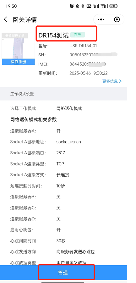5.點(diǎn)擊下方的“管理”,可以設(shè)置DTU的MQTT參數(shù),設(shè)置完所有參數(shù)后,需要點(diǎn)擊“配置網(wǎng)關(guān)”。