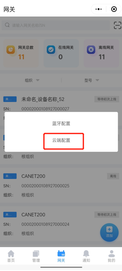 3.然后點(diǎn)擊“云端配置”并添加網(wǎng)關(guān)。