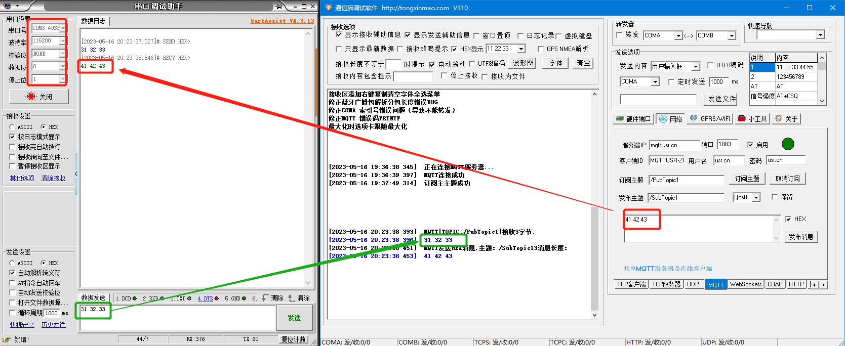 打開串口助手,選擇好串口參數(shù),串口助手和MQTT客戶端成功互發(fā)數(shù)據(jù)。