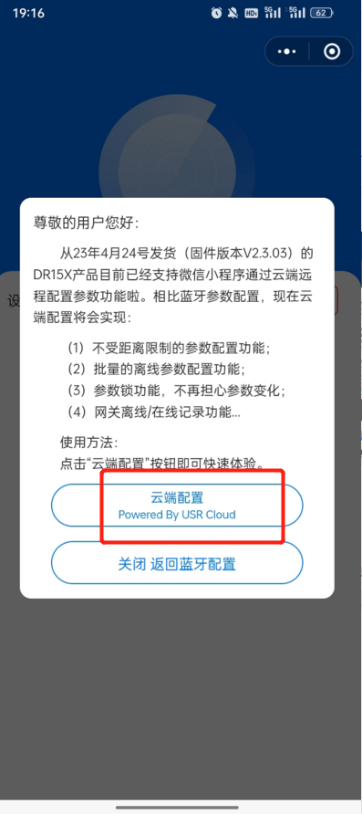 1.打開微信掃一掃DR154正面二維碼,并點(diǎn)擊“云端配置”。(打開手機(jī)藍(lán)牙功能)