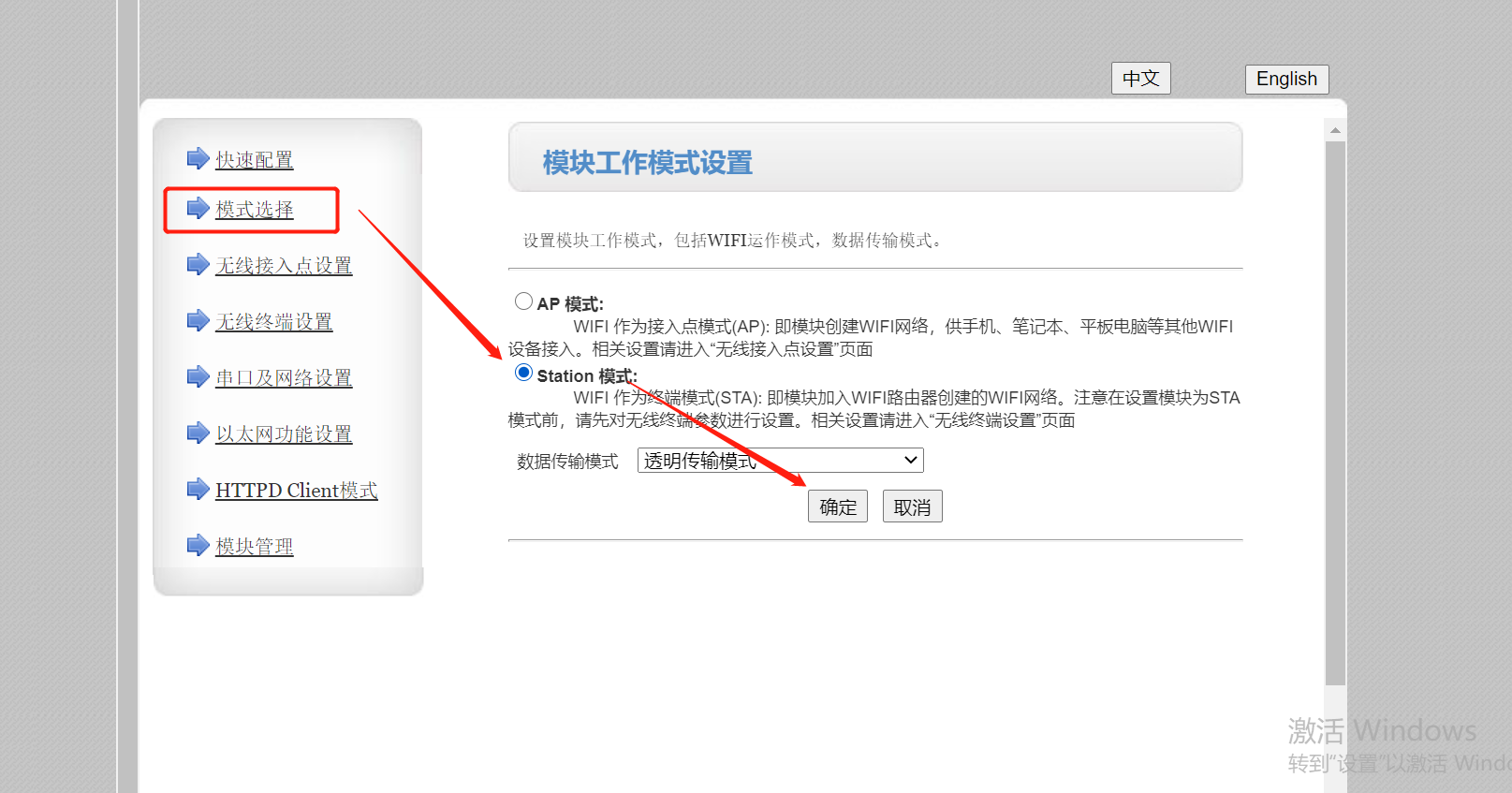 3. 選擇模式選擇為sta模式,點(diǎn)擊確定(先不要重啟,等設(shè)置完所有的參數(shù)再重啟設(shè)備)