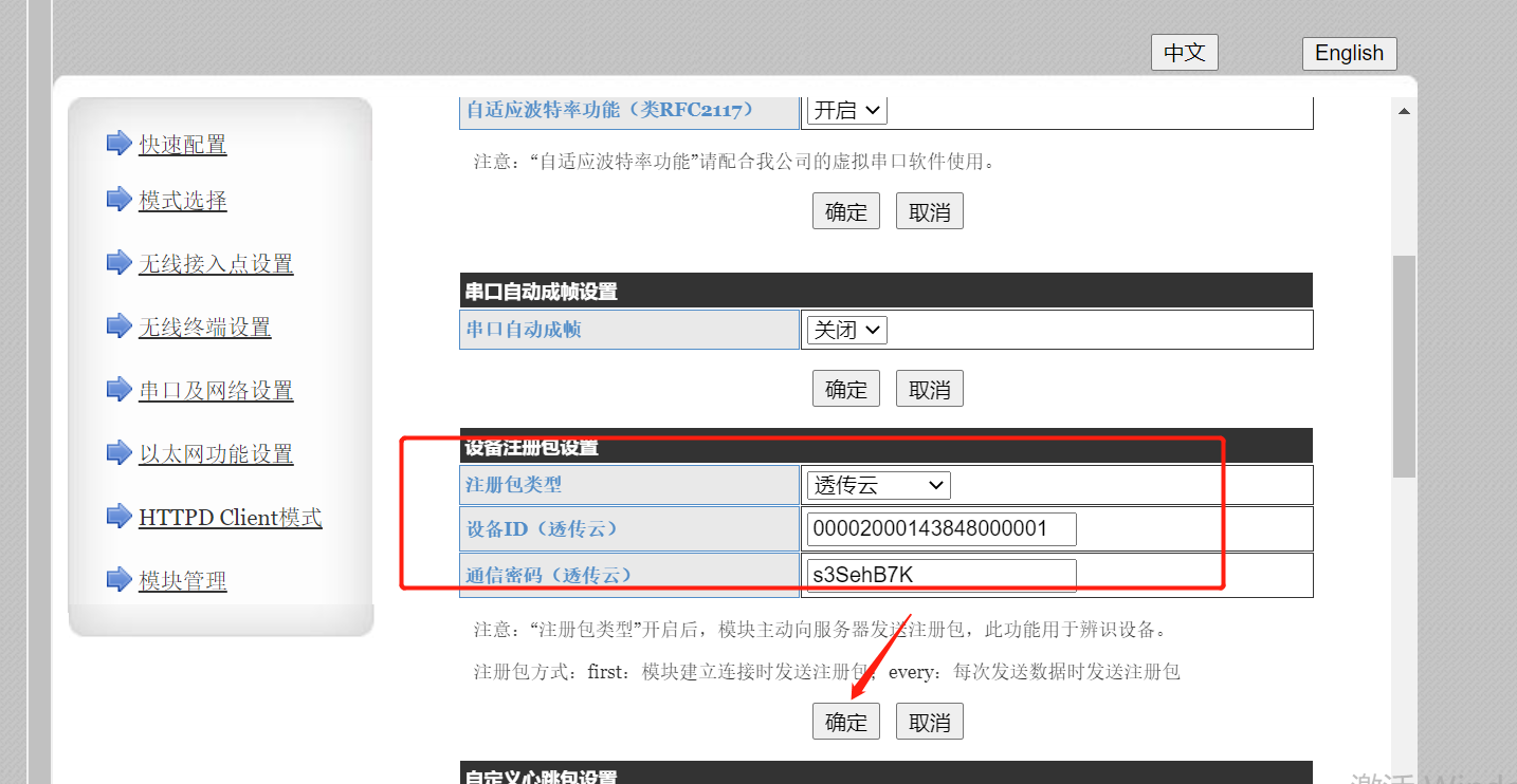 (2)注冊(cè)包選擇透?jìng)髟?,填上透?jìng)髟粕闲陆⒌脑O(shè)備id,和密碼(如下圖所示),點(diǎn)擊保存。