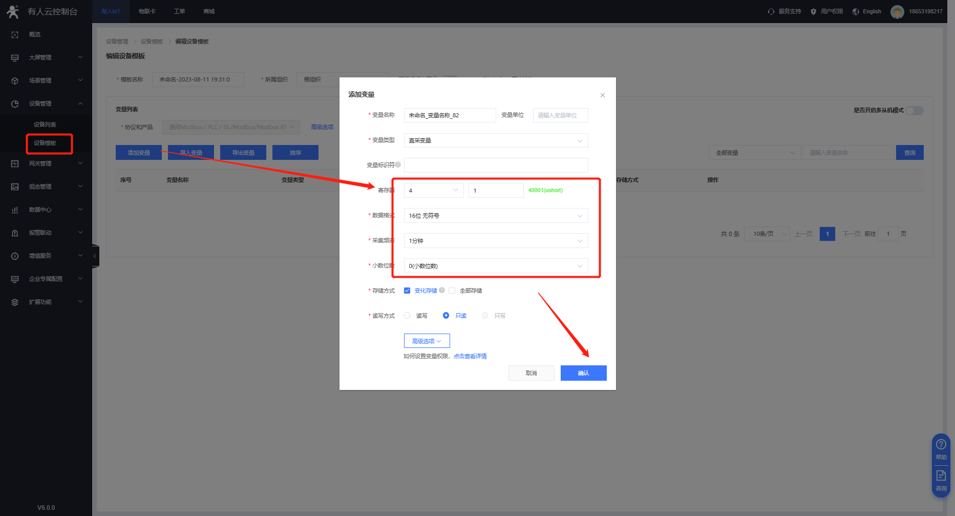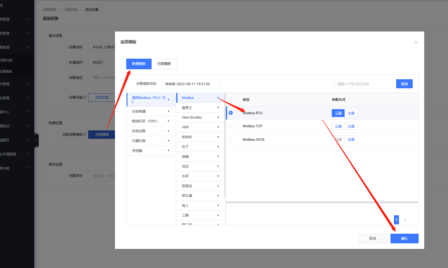 3.添加從機(jī)設(shè)備,關(guān)聯(lián)變量模板,w610支持modbus協(xié)議 云端輪詢方式。