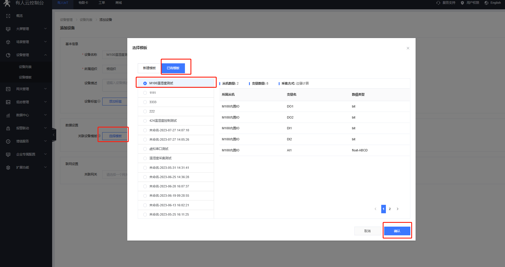 設(shè)備名稱:M100溫濕度測試---根組織---數(shù)據(jù)設(shè)置--選擇模板-已有模板---M100溫濕度測試---確認