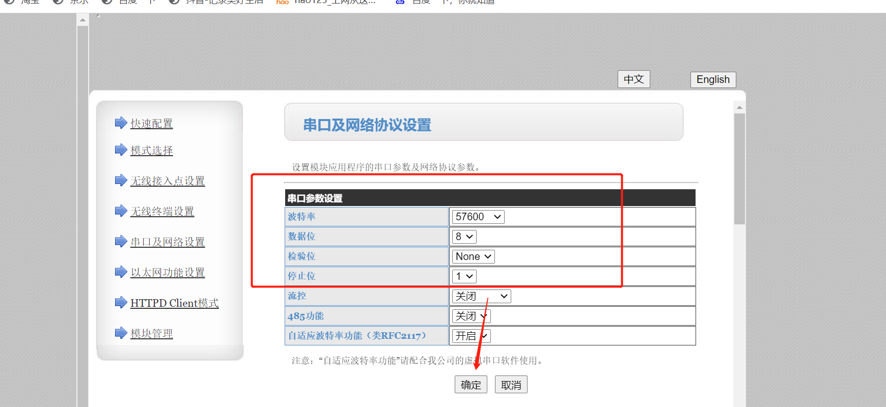 (1)串口及網絡參數設置:串口參數設置為和您終端設備的串口參數一致