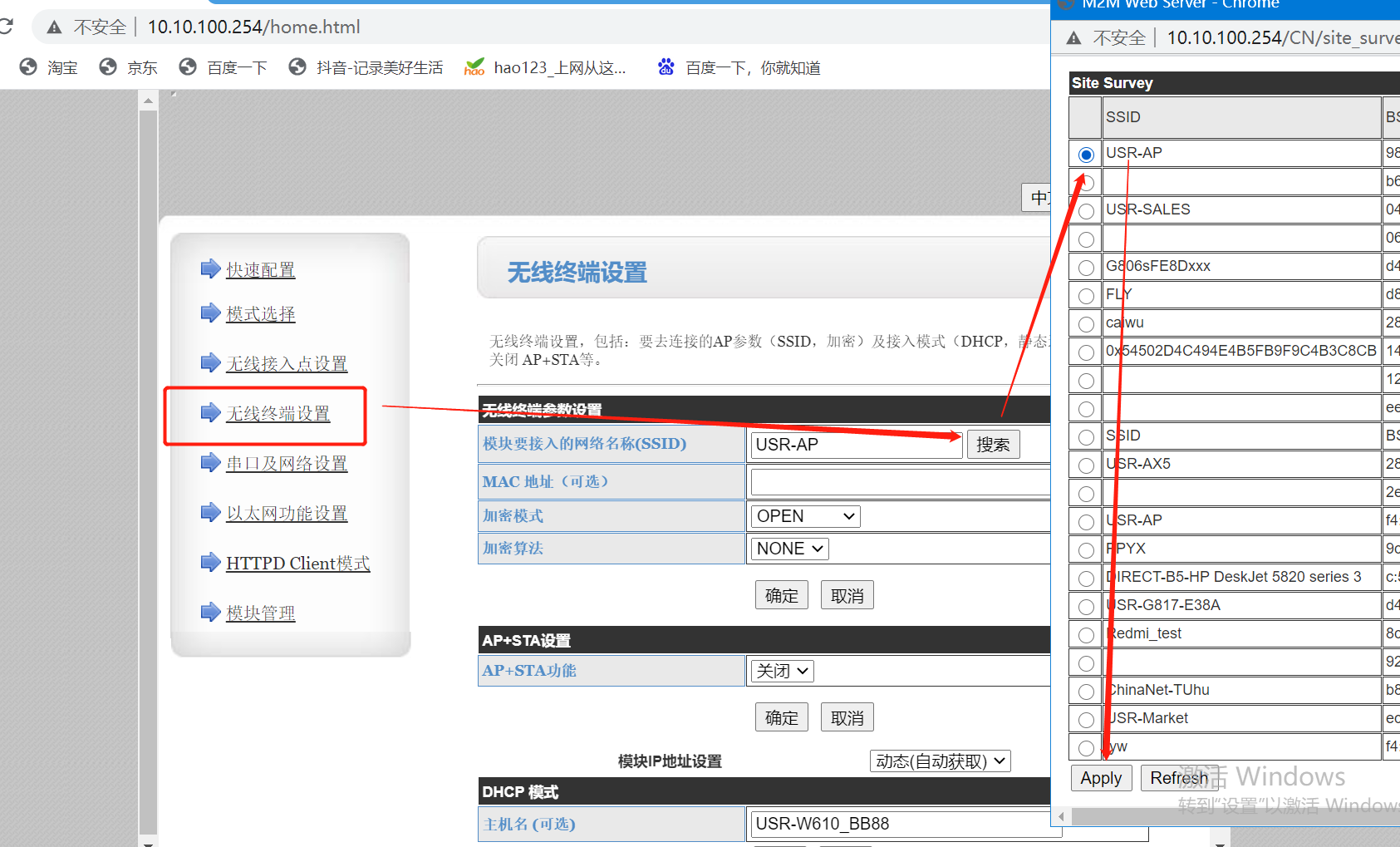 4.進入無線終端設置,搜索要連接的WiFi,選中以后點擊下方【apply】