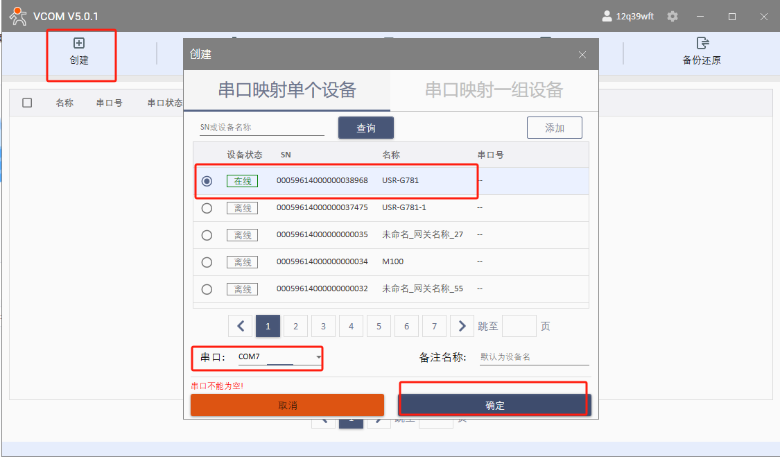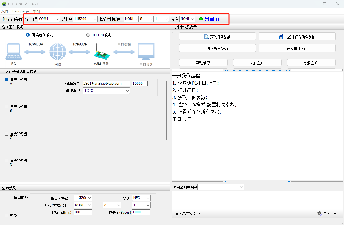 使用USB轉(zhuǎn)485轉(zhuǎn)換器接到電腦上,打開USR-G781配置軟件,從設備管理器中查看當前COM口4,軟件選擇COM4