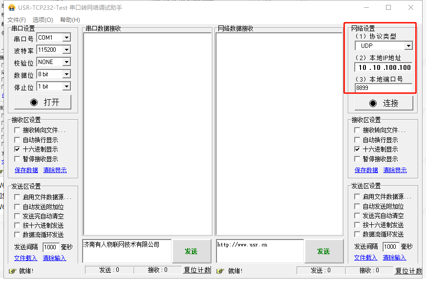 1.安裝并打開USR-TCP232-TEST測試工具,設(shè)置右側(cè)網(wǎng)絡(luò)端協(xié)議為UDP,本機(jī)IP設(shè)置為電腦鏈接W610wifi獲取的IP地址