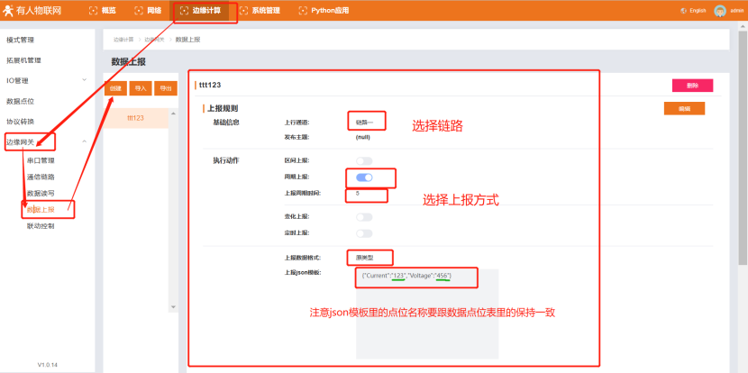 (4)創(chuàng)建“數(shù)據(jù)上報”規(guī)則,選擇“鏈路一”,根據(jù)需求配置上報方式和json模板,往下繼續(xù)添加點位表