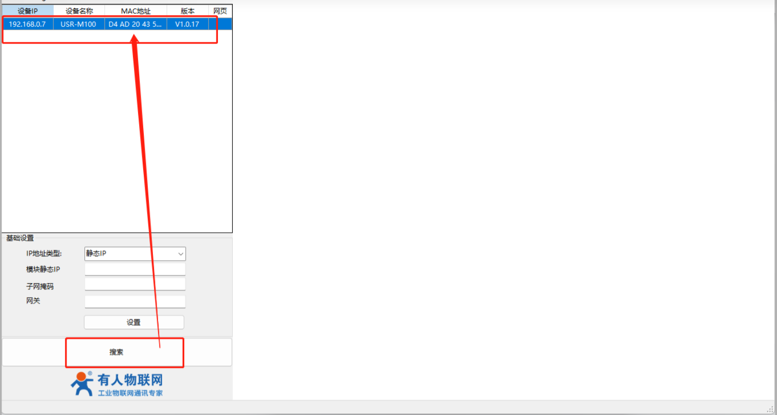 (4)下載并打開系列設(shè)置軟件:用配置軟件搜索M100設(shè)備,單擊搜索,搜搜到設(shè)備后雙擊設(shè)備。