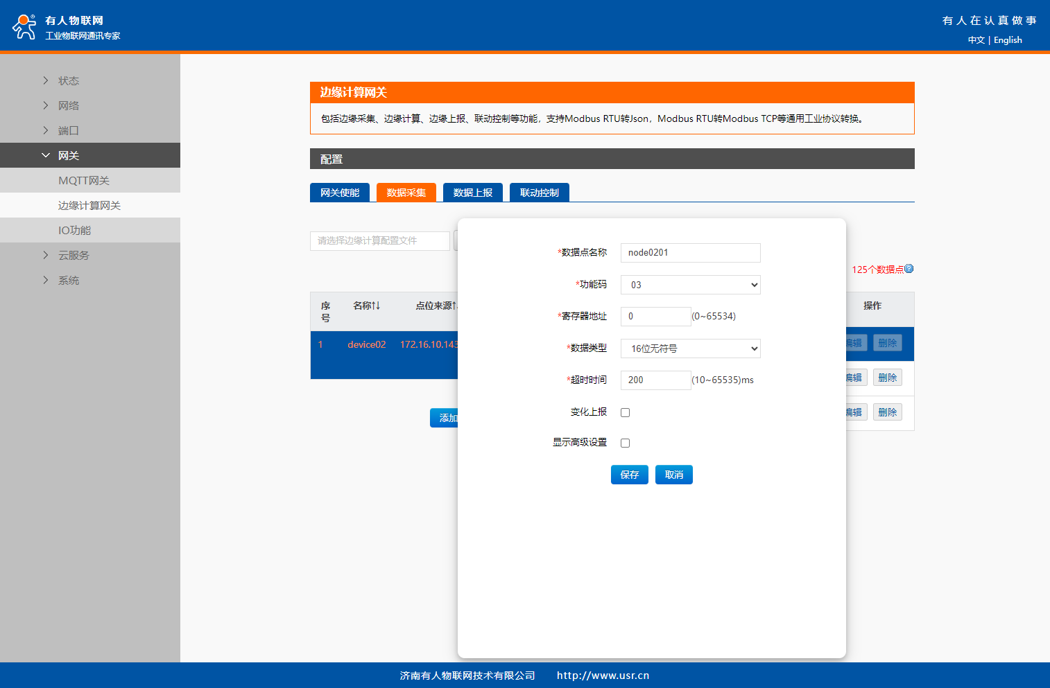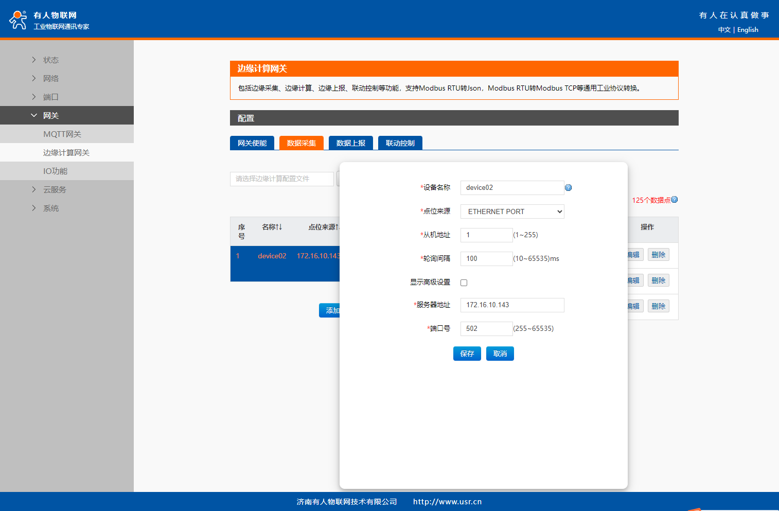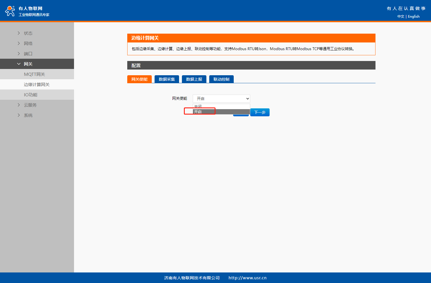 在“網(wǎng)關(guān)”-“邊緣計(jì)算”界面中開啟網(wǎng)關(guān)使能,點(diǎn)擊“下一步”在“數(shù)據(jù)采集界面”配置modbusTCP的數(shù)據(jù)點(diǎn)。