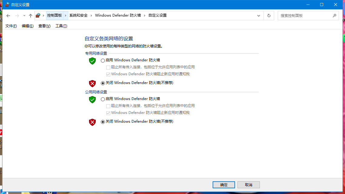 (2)電腦關(guān)閉防火墻和殺毒軟件:控制面板--系統(tǒng)和安全--Windows Defender 防火墻--關(guān)閉防火墻