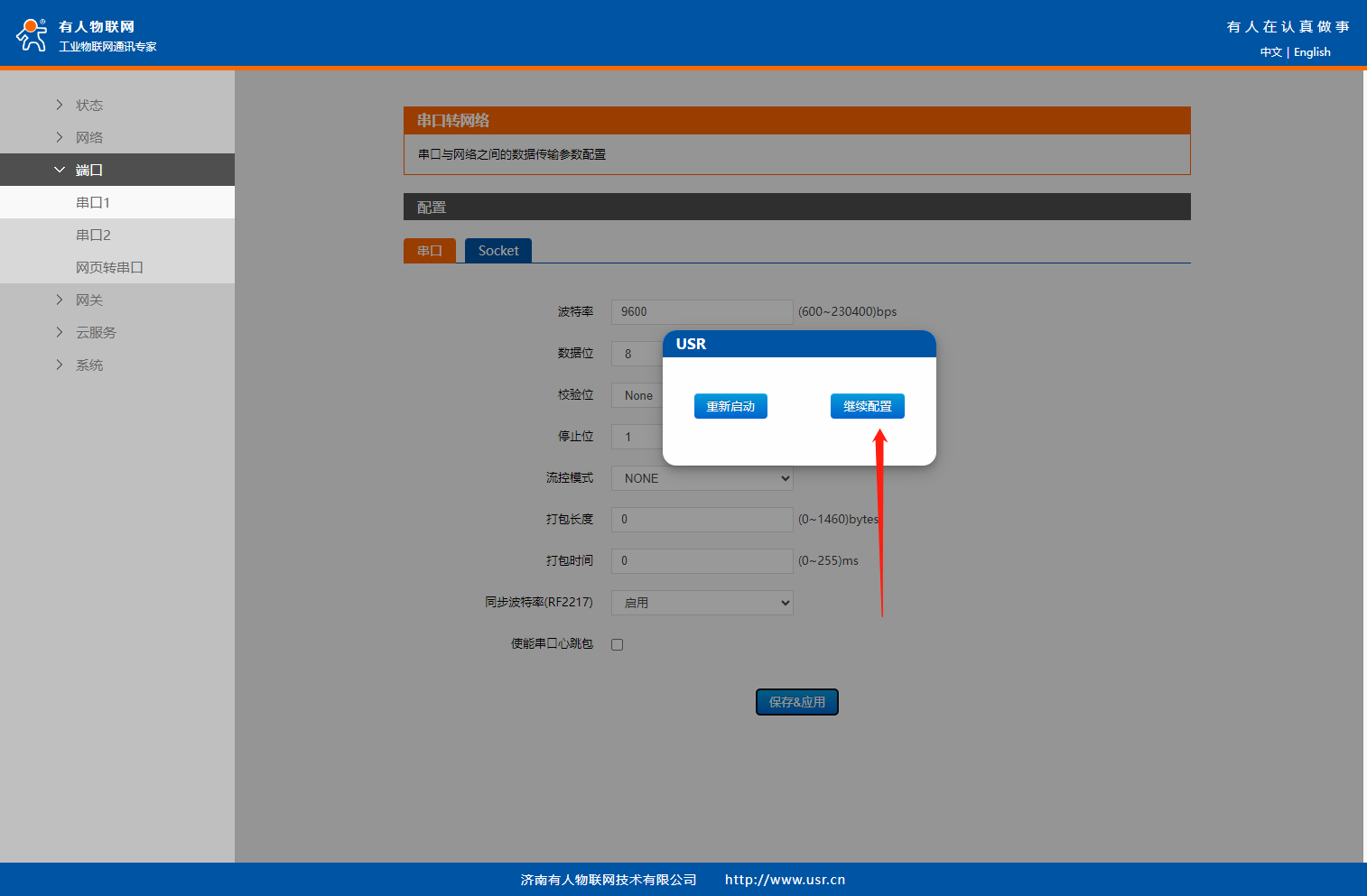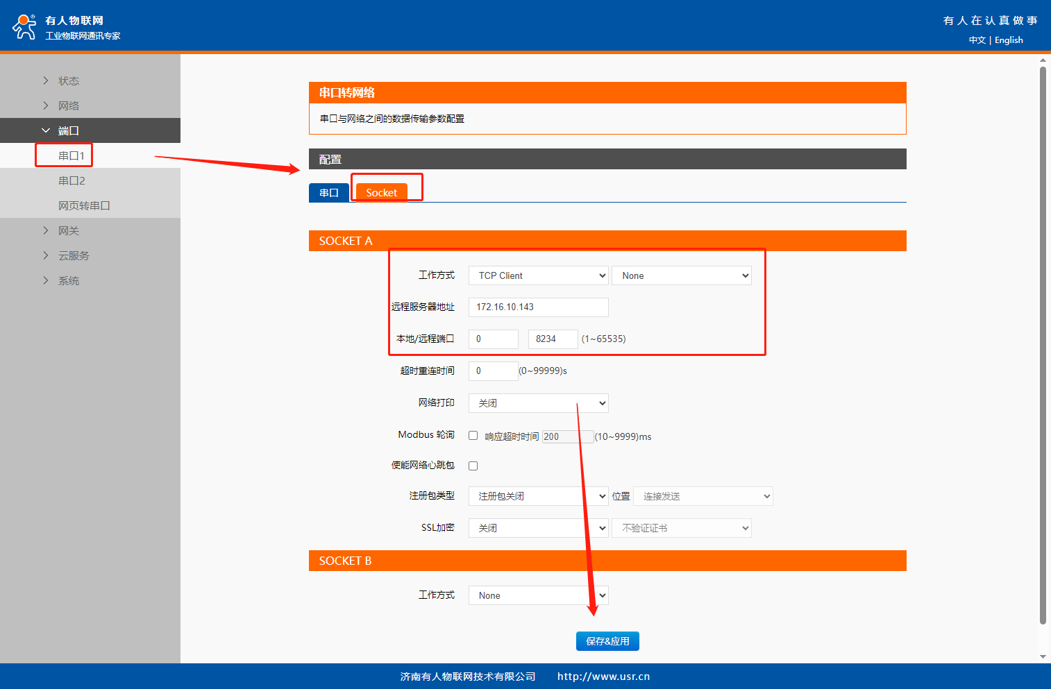 本案例測試服務(wù)器為我司 TCP服務(wù)器測試,用戶測試時(shí)請(qǐng)?jiān)凇岸丝凇?gt;“串口1” >“ Socket”界面配置自己TCP服務(wù)器的參數(shù)。