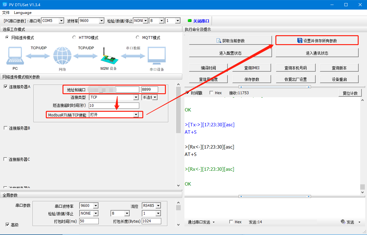 3.配置USR-S100連接遠(yuǎn)程TCP服務(wù)器,將遠(yuǎn)程服務(wù)器A參數(shù)修改為要連接服務(wù)器的IP和端口號(hào),開啟modbus RTU轉(zhuǎn)modbus tcp使能功能,點(diǎn)擊設(shè)置并保存所有參數(shù)