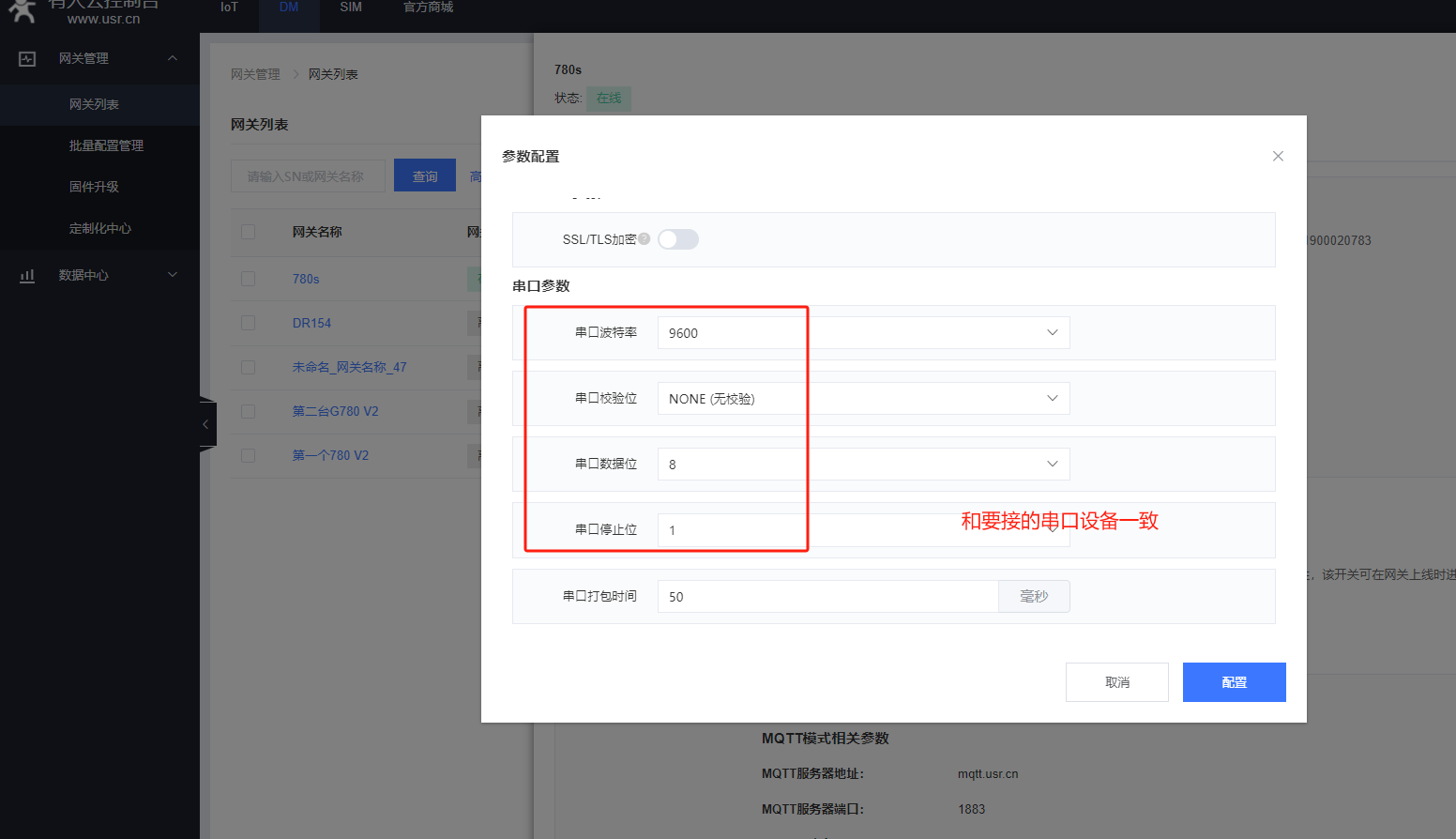 串口參數(shù)修改成和要接的串口設(shè)備一致: