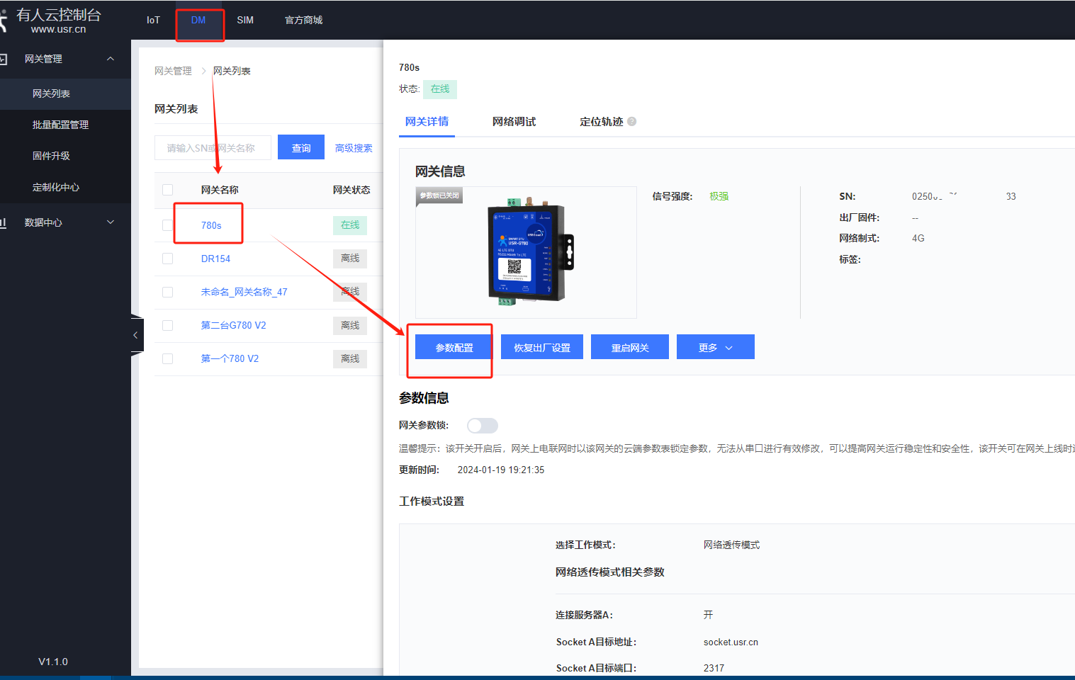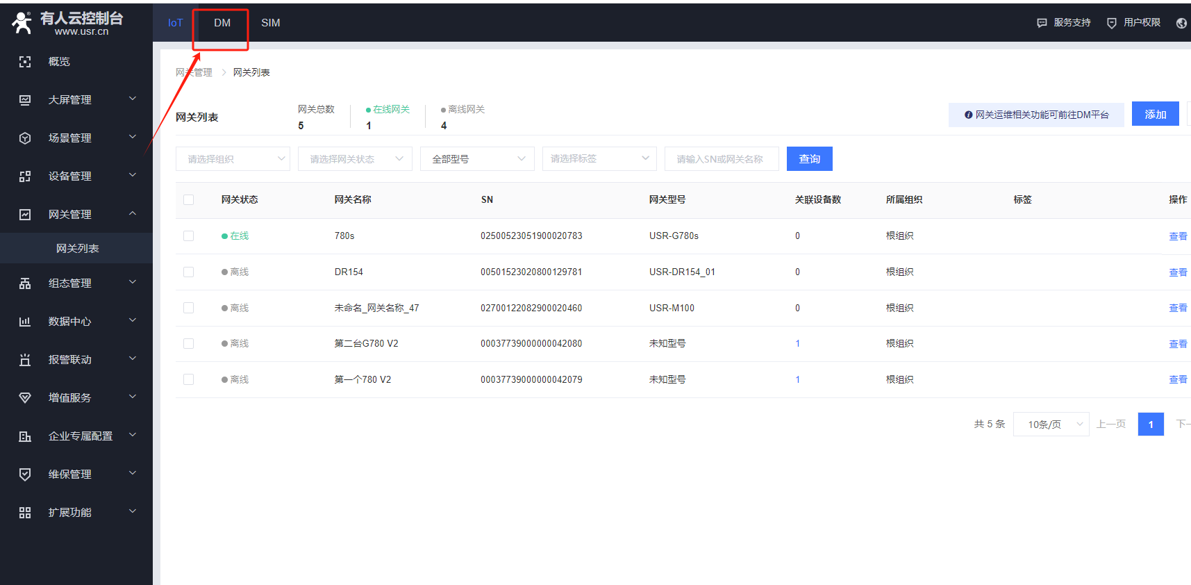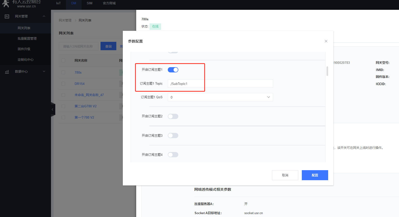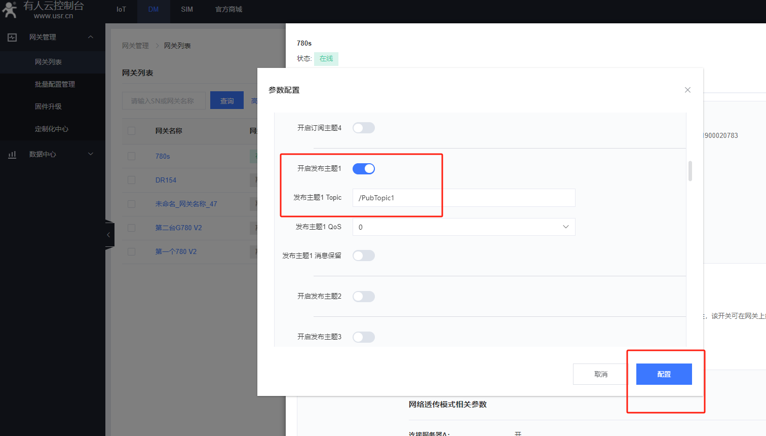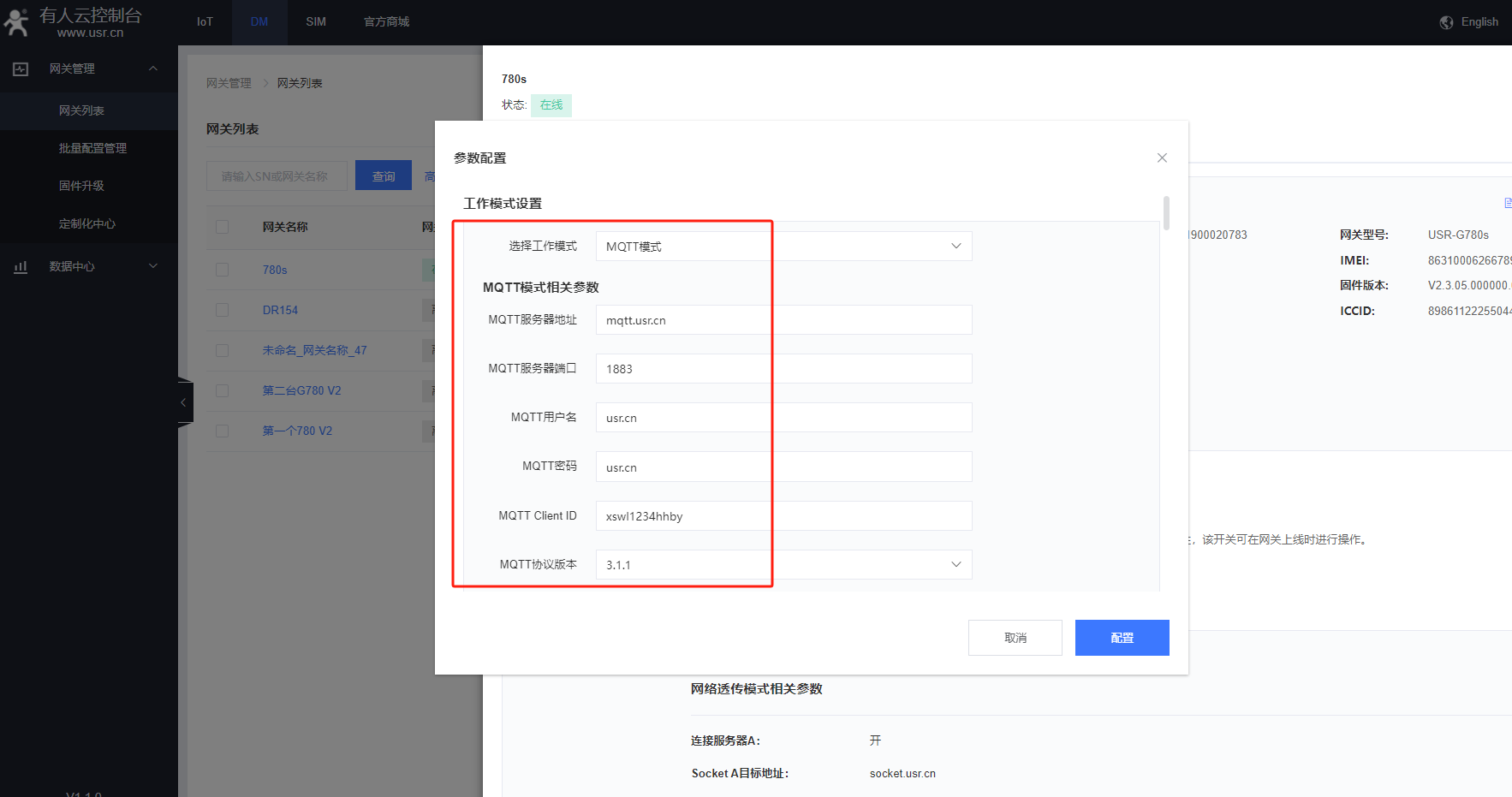 可以看到添加的網(wǎng)關(guān),點(diǎn)擊DM平臺,跳轉(zhuǎn)配置網(wǎng)關(guān)連接mqtt服務(wù)器