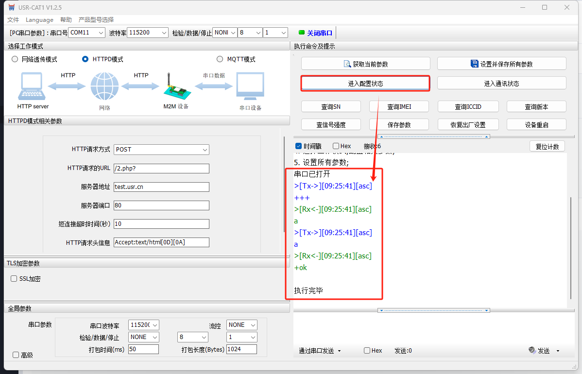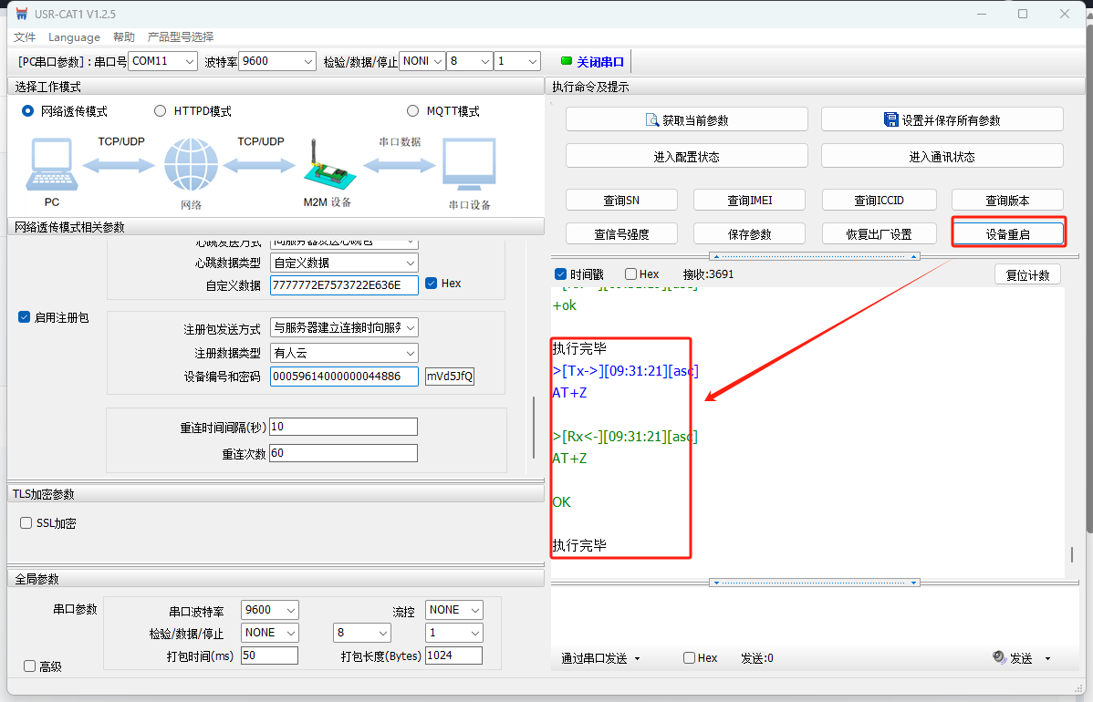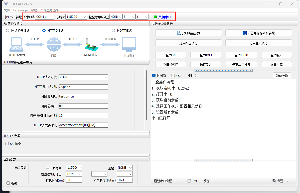 打開WH-LTE-7S0上位機(jī)軟件,選擇COM11,115200 NONE 8 1,打開串口。