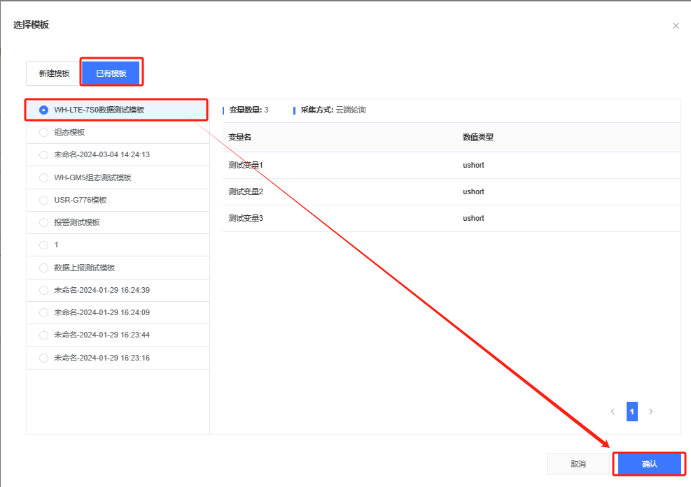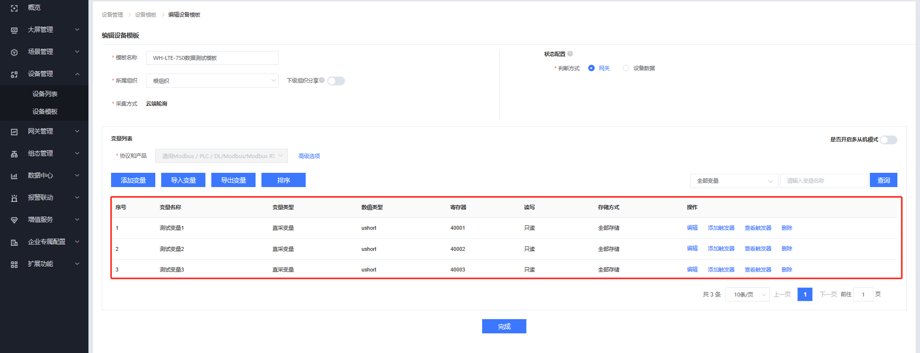 填入模板名稱,選擇根組織,采集方式選擇云端輪詢,協(xié)議選擇通用Modbus/PLC/DL / Modbus / Modbus RTU,點(diǎn)擊添加變量