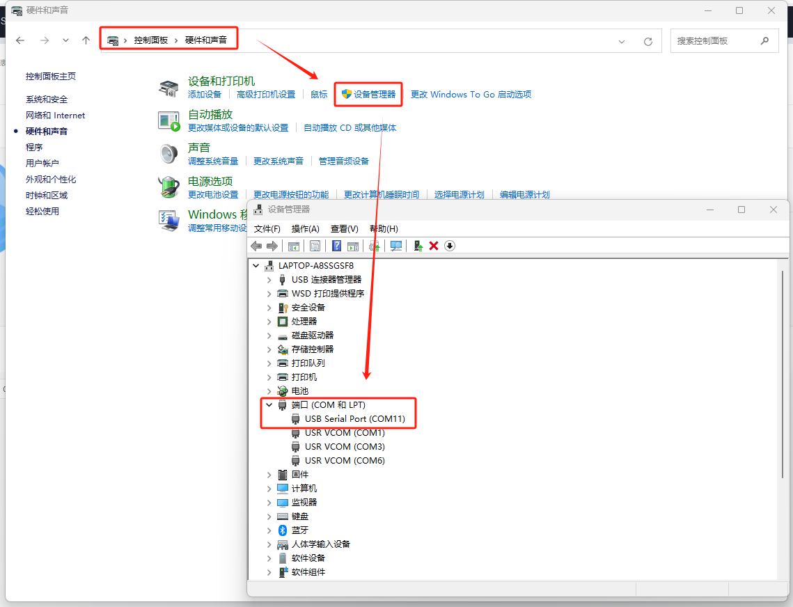 打開電腦控制控制面板---硬件和聲音---設(shè)備管理器---COM和LPT,確認(rèn)COM口為COM11。