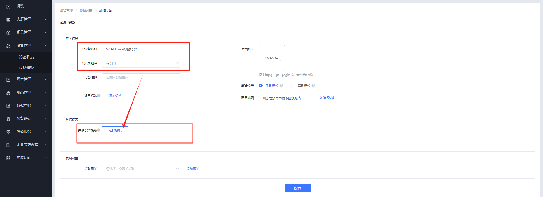 添加設(shè)備并關(guān)聯(lián)模板和網(wǎng)關(guān),點(diǎn)擊保存