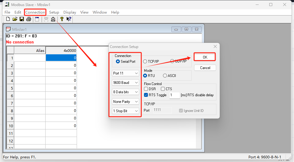 打開Modbus Slave 軟件,選擇COM11,填入WH-LTE-7S0的參數(shù) 9600 none 8 1,點(diǎn)擊OK