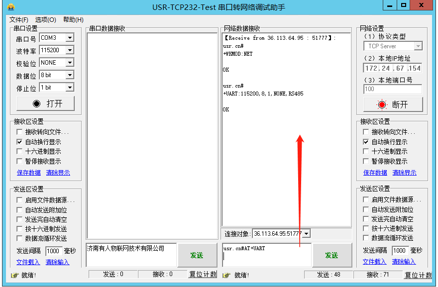 以查詢工作模式為例,發(fā)送usr.cn#AT+UART,后面帶回車換行,網(wǎng)絡(luò)助手接收到查詢到的AT指令參數(shù)。