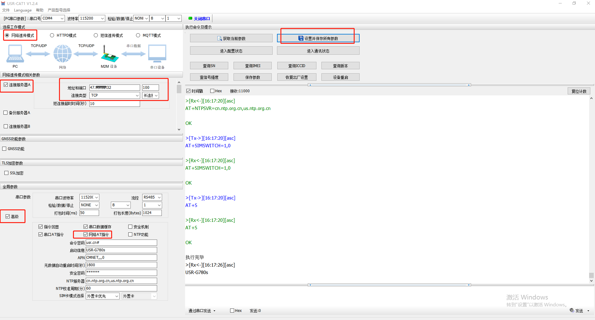 4、選擇網(wǎng)絡(luò)透傳模式,勾選連接服務(wù)器A,地址填遠(yuǎn)程服務(wù)器地址,端口用100,勾選高級,勾選網(wǎng)絡(luò)AT指令(默認(rèn)開啟),點擊設(shè)置并保存所有參數(shù),然后再關(guān)閉串口。