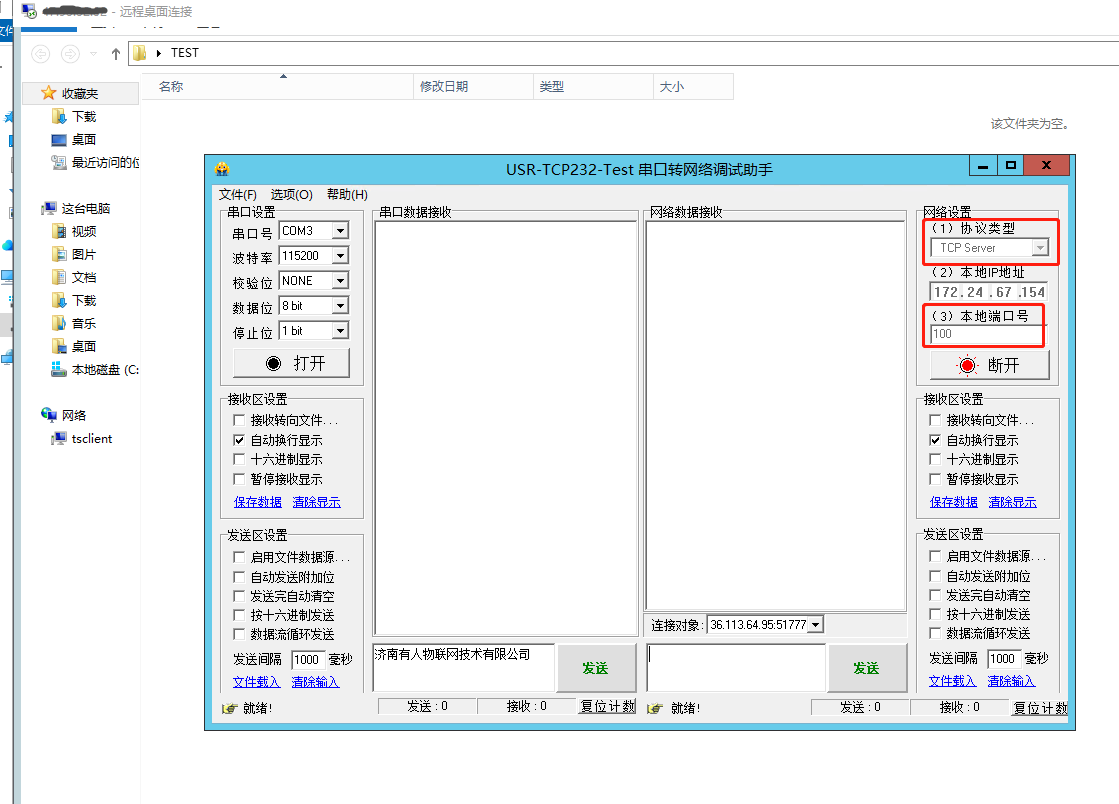 登錄遠(yuǎn)程服務(wù)器,打開一個網(wǎng)絡(luò)助手,協(xié)議用TCP server,端口100,點擊連接。